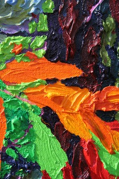 This photograph shows the actual size of the thick impasto paint of a 2" x 4" surface area on a 5 foot x 5 foot original painting. The organic brushstrokes and the consistency of the thick paint combine to provide the painting with unity, depth, abstraction and the qualities of sunlight filtering through the forest. I enjoy painting with heavy impasto because it slows down the process of creating and imbues the painting with substance. Concepts of time and depth in my paintings are represented in an effort to balance our current society’s insatiable need for speed, superficiality and disposablity.